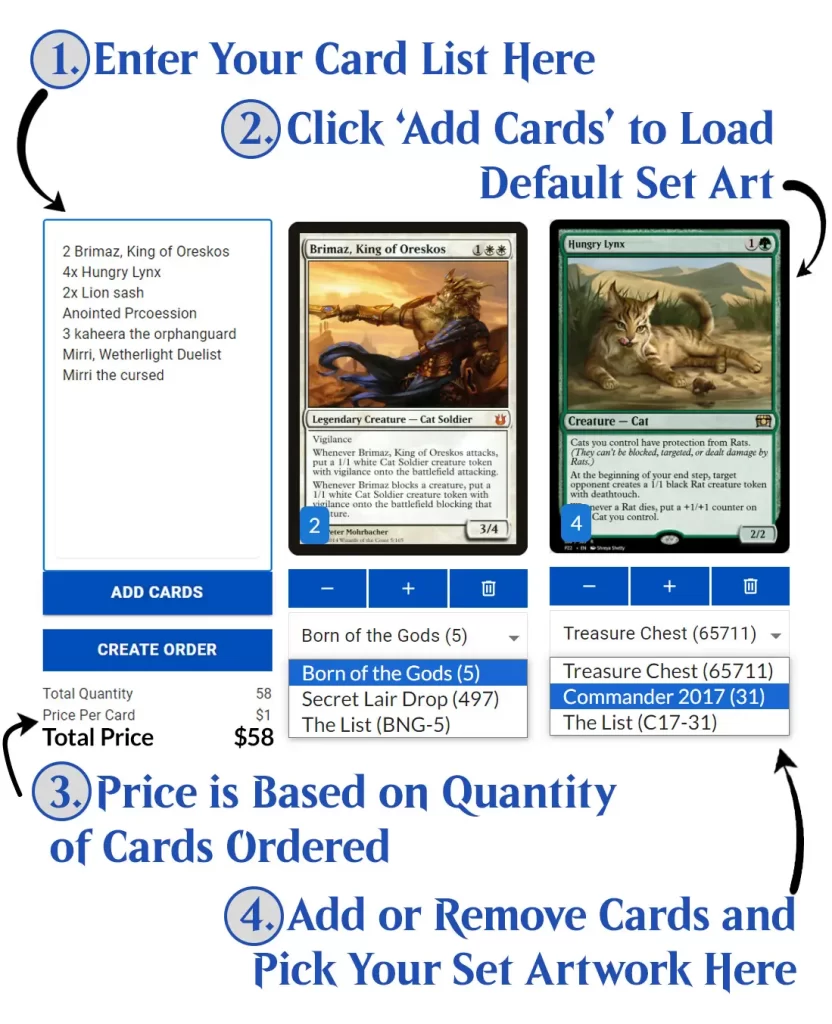 - User-Friendly Interface: You can paste in a deck list from any of the major deck building tools online. So just paste in your card list, choose the card art for each card, and choose the quantity you need. It’s easy to print an entire commander deck, or even a cube.
