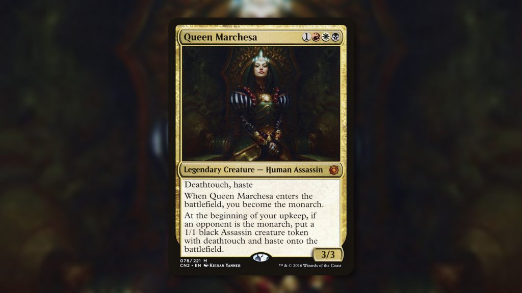 Queen Marchesa serves as an excellent case study for the Monarch mechanic in Magic: The Gathering, demonstrating the strategic depth it adds to gameplay. When Marchesa enters the battlefield, the player becomes the Monarch, immediately benefiting from the card draw at the end of their turn. If the player loses Monarch status, Marchesa compensates by creating 1/1 black Assassin creature tokens with deathtouch, offering both a defensive and offensive strategy to regain control. This card highlights the Monarch mechanic’s impact on game dynamics, encouraging aggression and strategic planning.