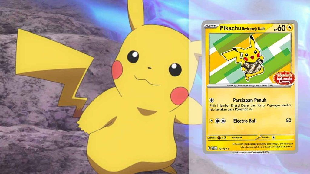 Reported by PokeGuardian, the card is being printed and distributed as part of Pikachu’s Indonesia Journey. The artwork on the card depicts Pikachu wearing a batik shirt, a traditional Indonesian garment crafted using wax during the manufacturing process. Patterns are formed on the cloth by printing wax onto it, protecting certain areas while dyeing the rest, resulting in intricate designs. If you’ve never seen a batik shirt before, take a look at the one Pikachu is wearing on the card.