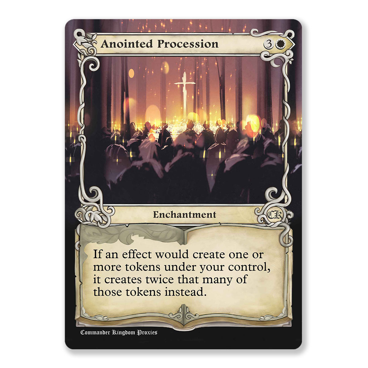 Like this MTG design? Use our MTG Card Maker to customize your own Adventure Style MTG Proxies.For Anointed Procession, a key gameplay tip revolves around its ability to double the number of tokens you generate. This ability stacks exponentially with additional copies of Anointed Procession itself or similar effects, dramatically increasing your token production. For instance, if you control Anointed Procession and cast a spell that would create multiple types of tokens, you’ll receive twice as many of each type. This makes it especially potent in token-focused decks, such as those that might also want to include cards like Doubling Season or Parallel Lives for even greater effect.