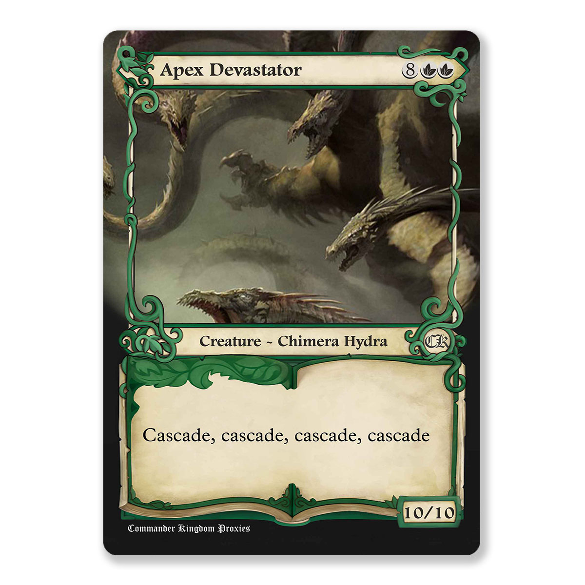 Like this MTG design? Use our MTG Card Maker to customize your own Adventure Style MTG Proxies.For Apex Devastator, a colossal creature with four instances of cascade, it embodies the spirit of “value” in gameplay. The cascade ability allows you to essentially cast up to four additional spells for free as you exile cards from the top of your library until you exile a nonland card that costs less, which you may cast without paying its mana cost. This process repeats for each cascade trigger. Given its high mana cost, integrating ways to cheat it into play or ramping up your mana production is advisable. The creature’s power lies not only in its formidable 10/10 stats but significantly in the potential cascade of spells it brings into play, potentially altering the battlefield’s state in your favor almost immediately. Each cascade operates independently, offering a unique way to sift through your library and cast multiple spells, thereby providing a significant advantage in terms of board presence and resource advantage.