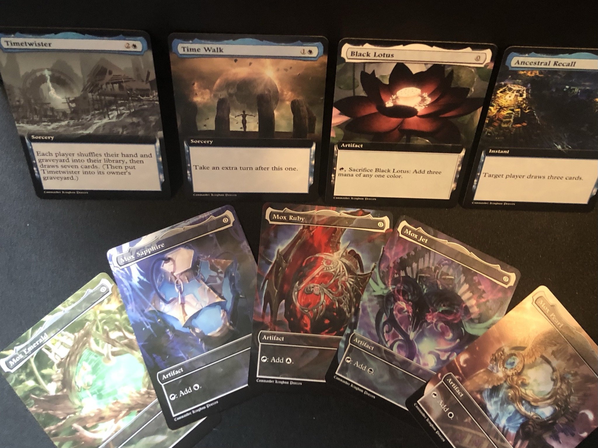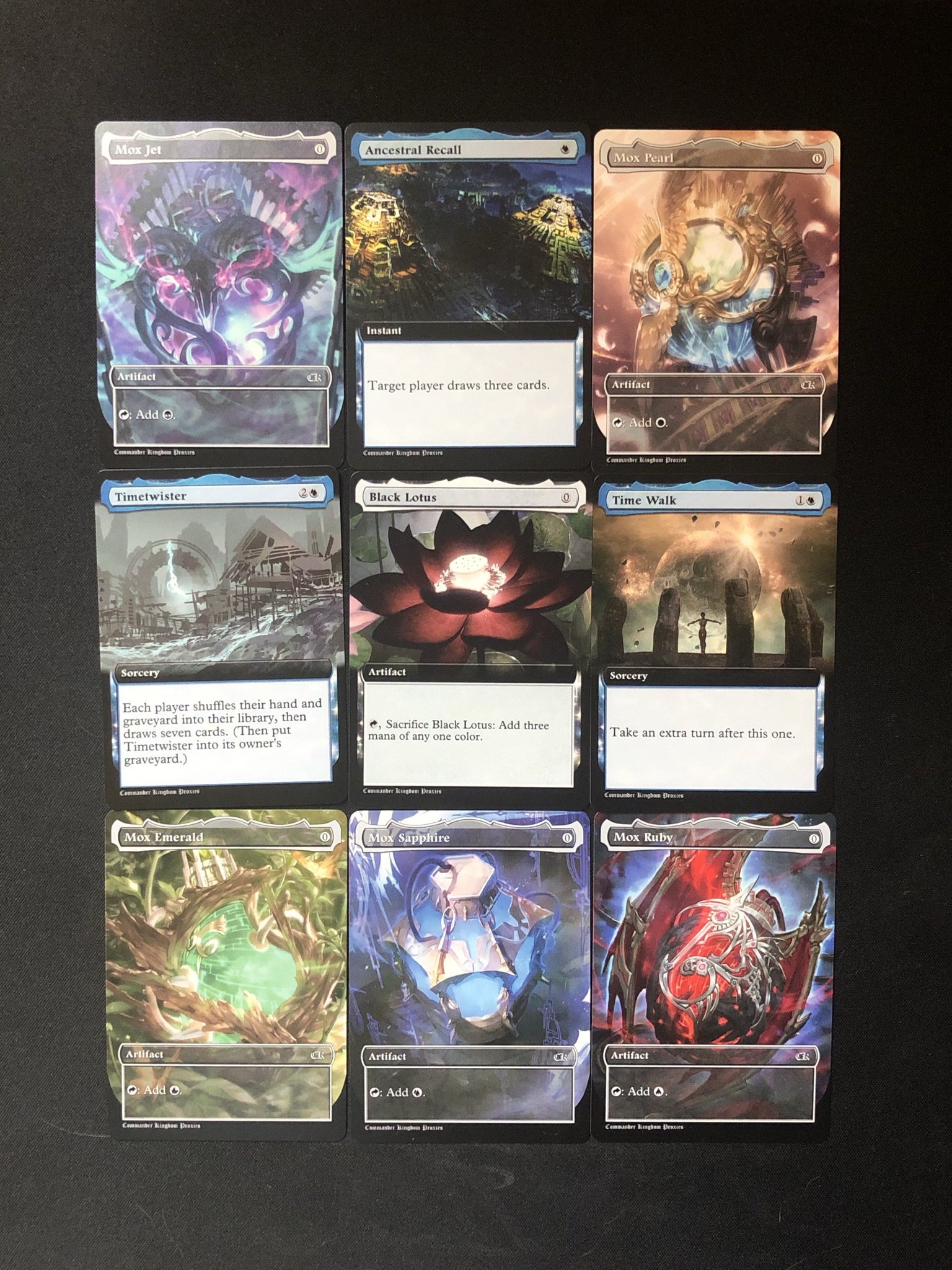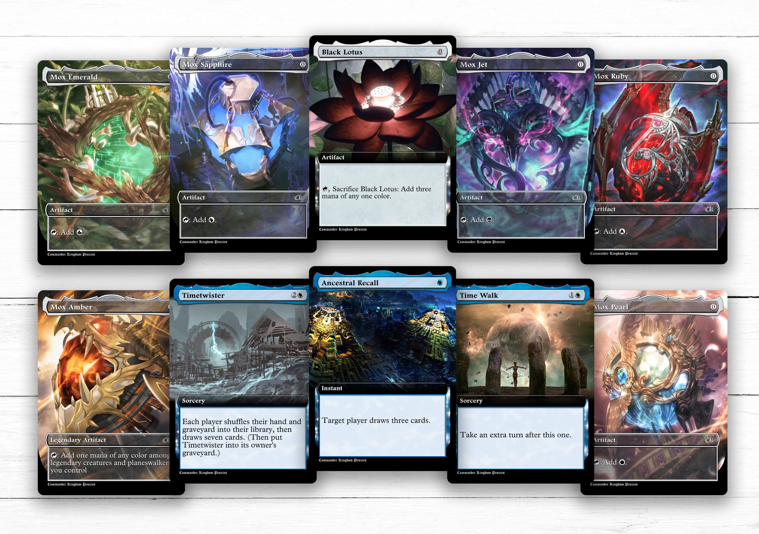 Each card in the Power 9 set—Black Lotus, Ancestral Recall, Time Walk, and the six Moxen (Pearl, Sapphire, Jet, Ruby, Emerald, and Lotus)—has been endowed with a unique artistic vision that encapsulates its essence and historical significance. The custom artwork captures the mystique and allure of these legendary cards, with visuals that tell a story of untold power and timeless majesty. The attention to detail in the art is matched only by the premium quality of the printing, ensuring that each proxy is a masterpiece worthy of the most discerning collections.