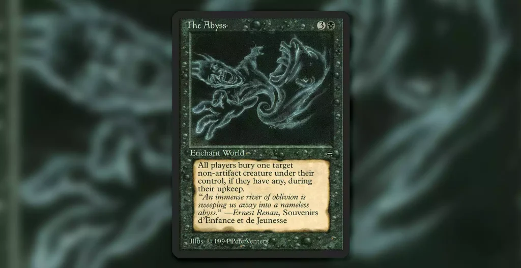 The Abyss is a famous card in Magic: The Gathering. It’s a World Enchantment originally printed in Legends, and it costs three generic mana plus one black. Its effect says that at the beginning of each player’s upkeep, they must destroy a nonartifact creature of their choice that they control, and it can’t be regenerated. It’s a powerful tool that adds an ongoing threat to any game, forcing players to constantly adapt or lose key creatures. While its original version can be expensive, an Abyss Proxy can offer an affordable path for those looking to experience the same gameplay impact without stretching their budget.